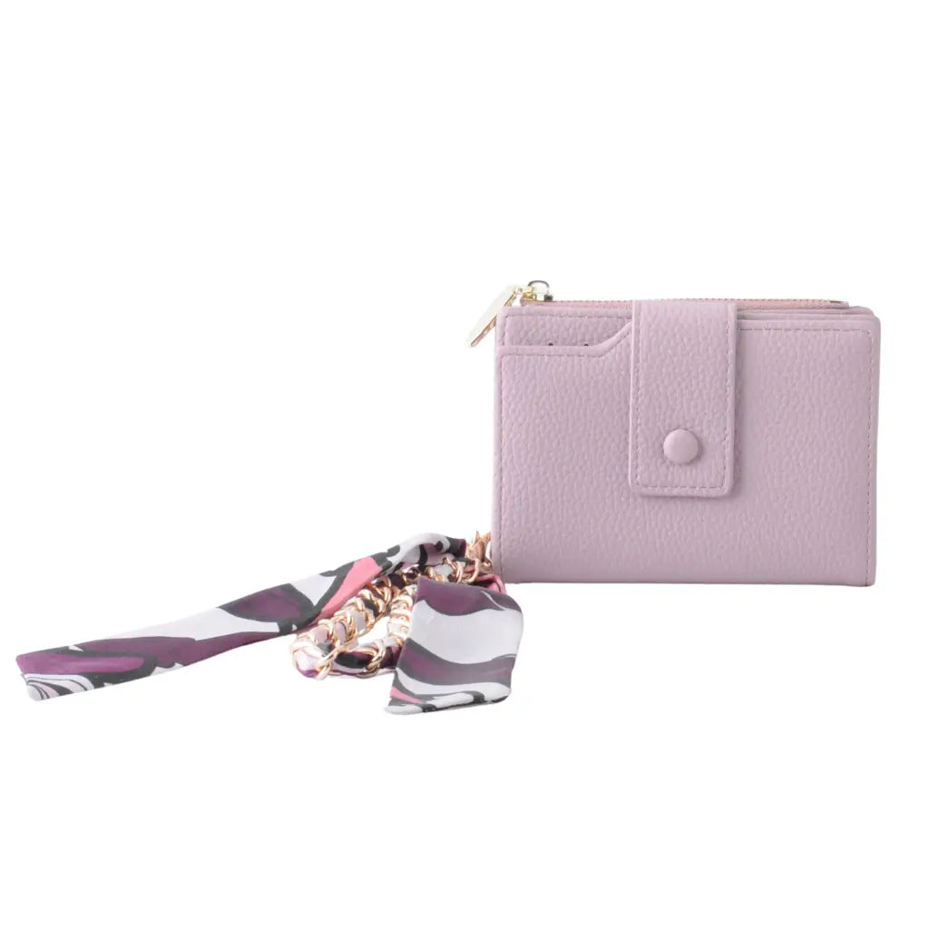 What sets this wristlet apart is its signature patterned scarf hang-off, featuring a contemporary print that’s delicately woven through a gold chain–inspired detail. The result? A polished, feminine accent that feels luxe and fashion-forward, instantly transforming a simple wallet into a standout piece.
