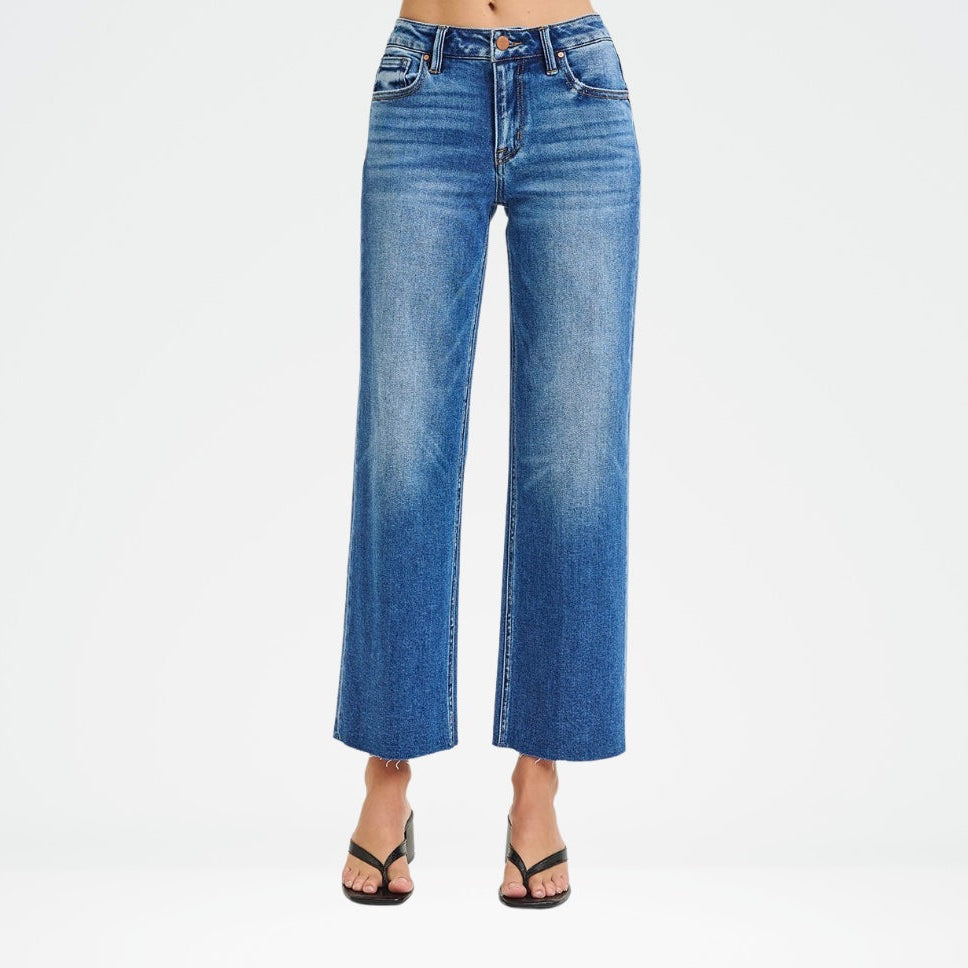 With a mid-rise waist and a crop wide-leg silhouette, they elongate the legs and pair beautifully with heels, sandals, or sneakers. The raw clean cut hem adds a modern edge, making these jeans a versatile staple you can dress up or down.